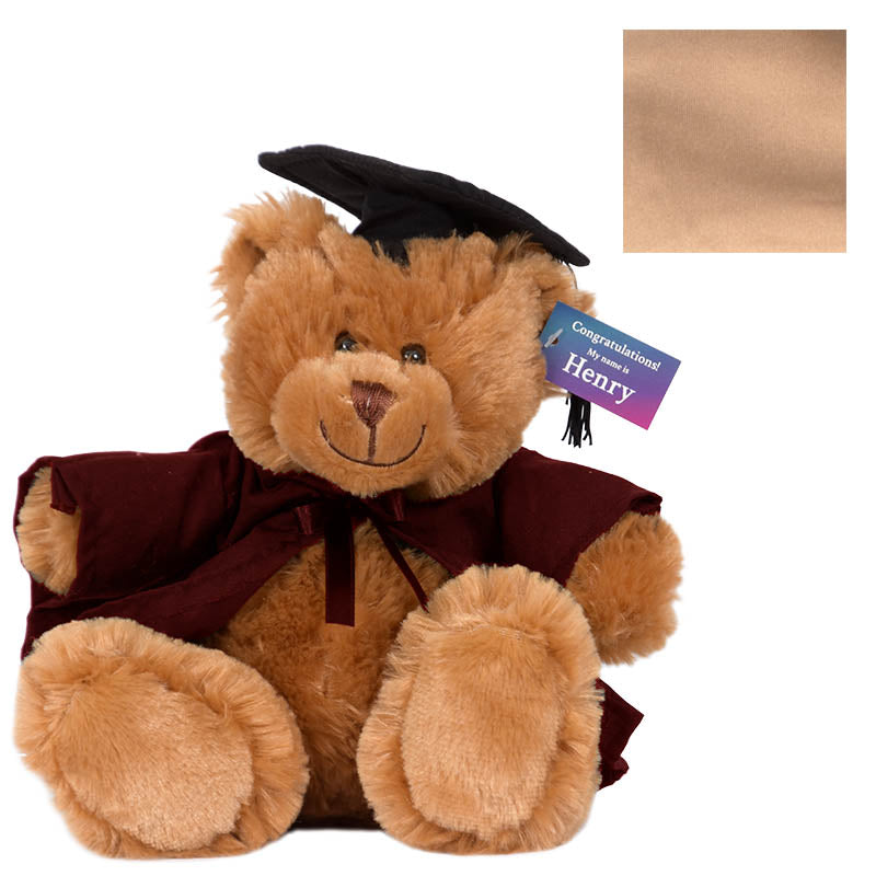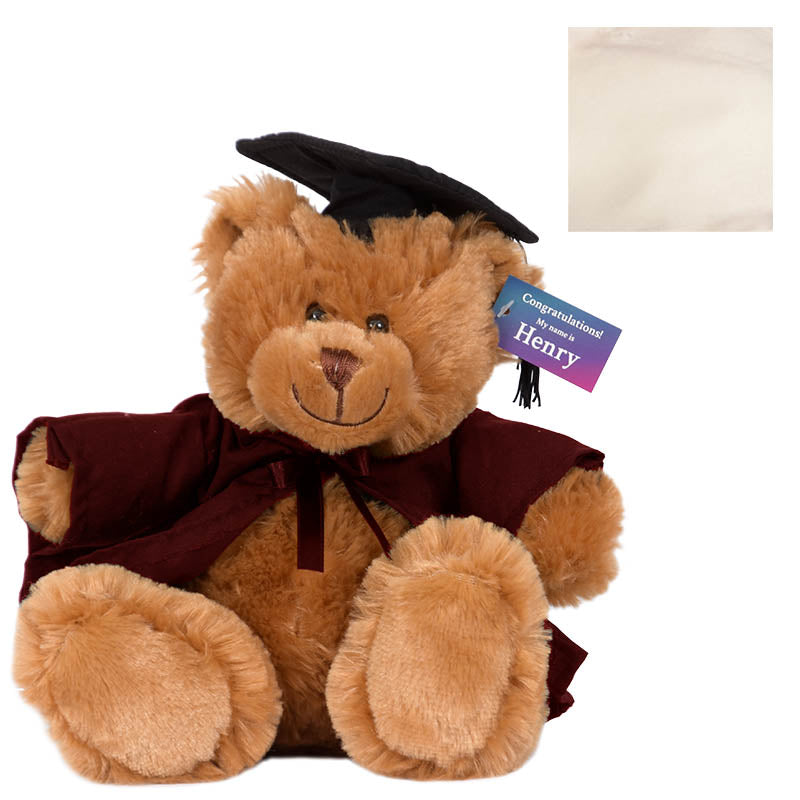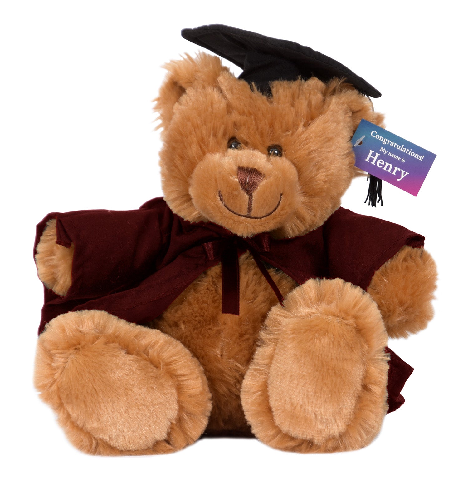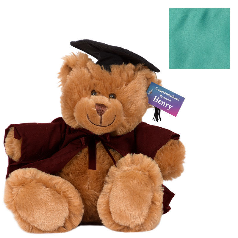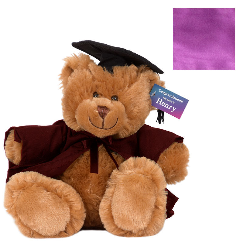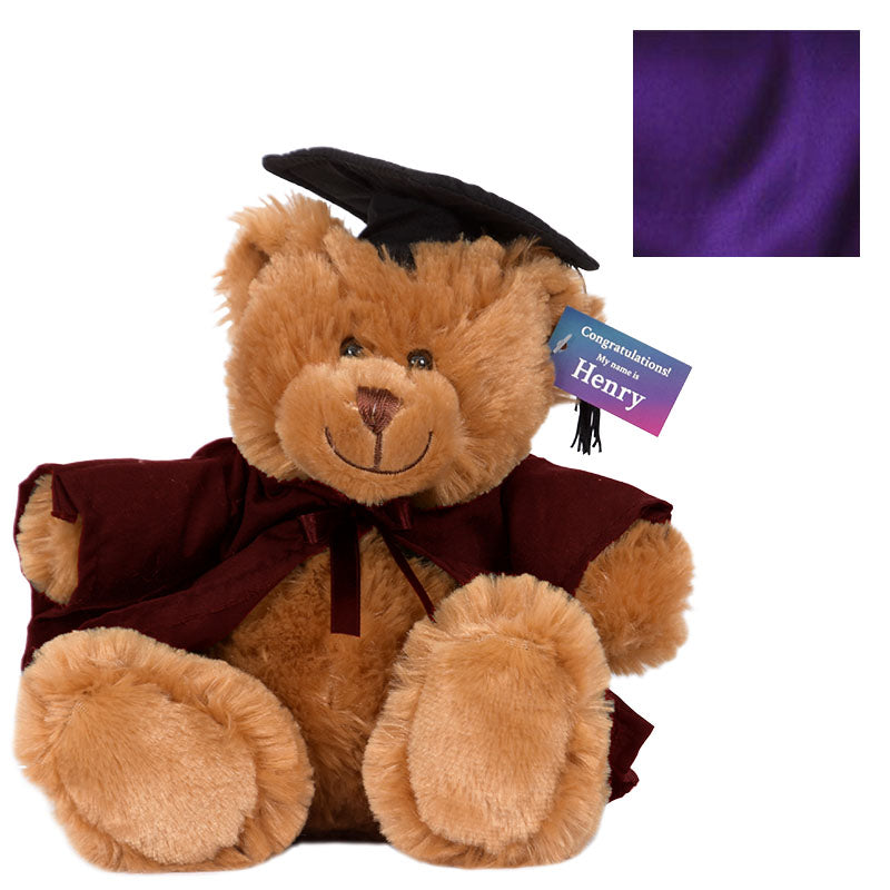 Cuddly Henry bear has long reddish-brown fur and comes complete with graduation cap, robe & hood in your faculty colour