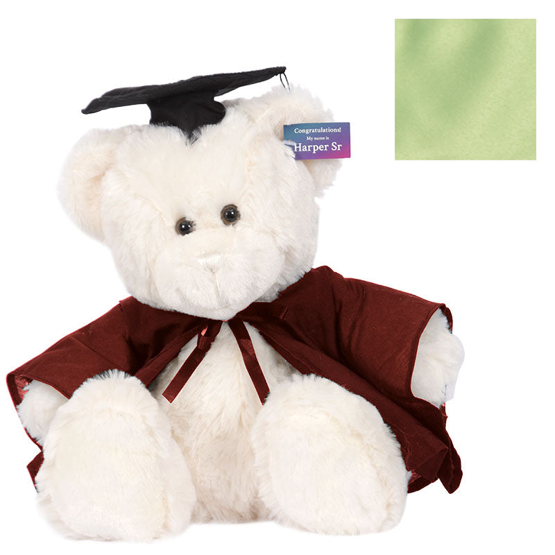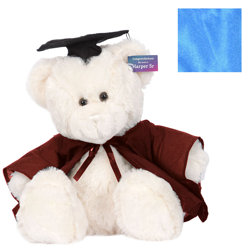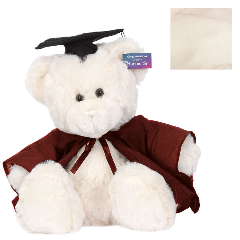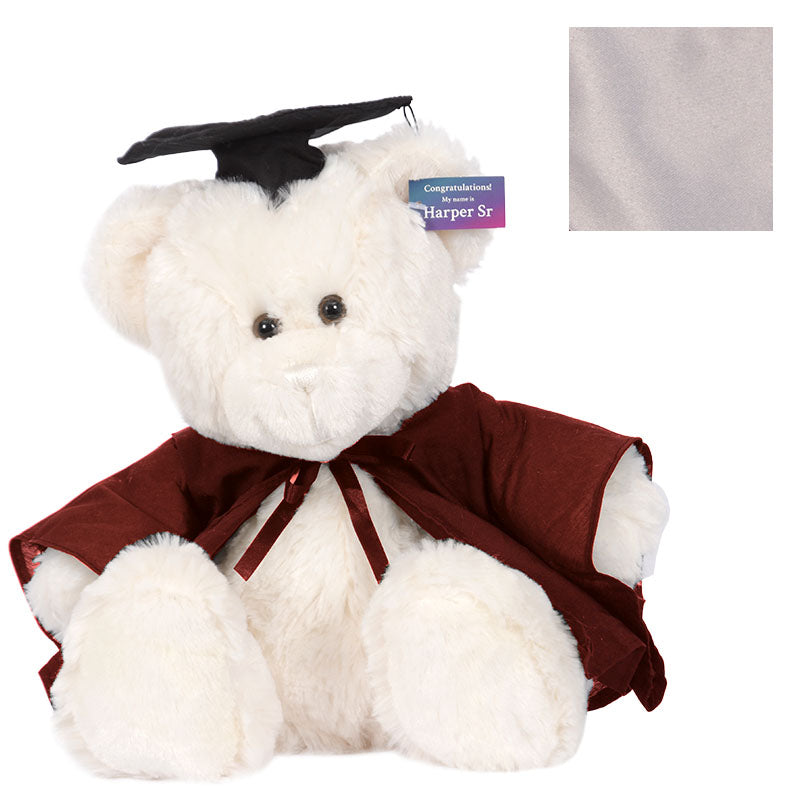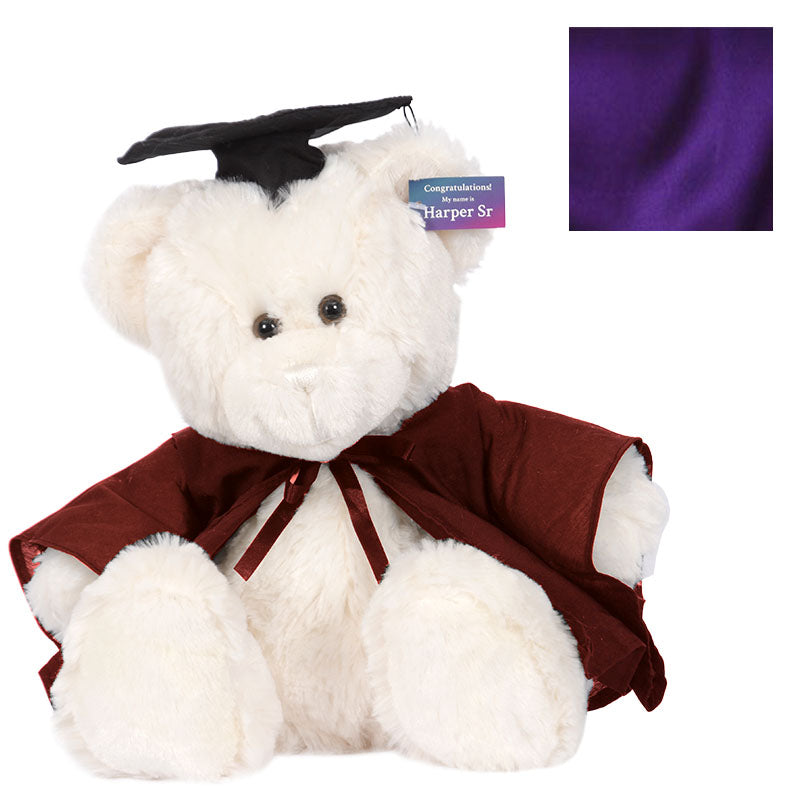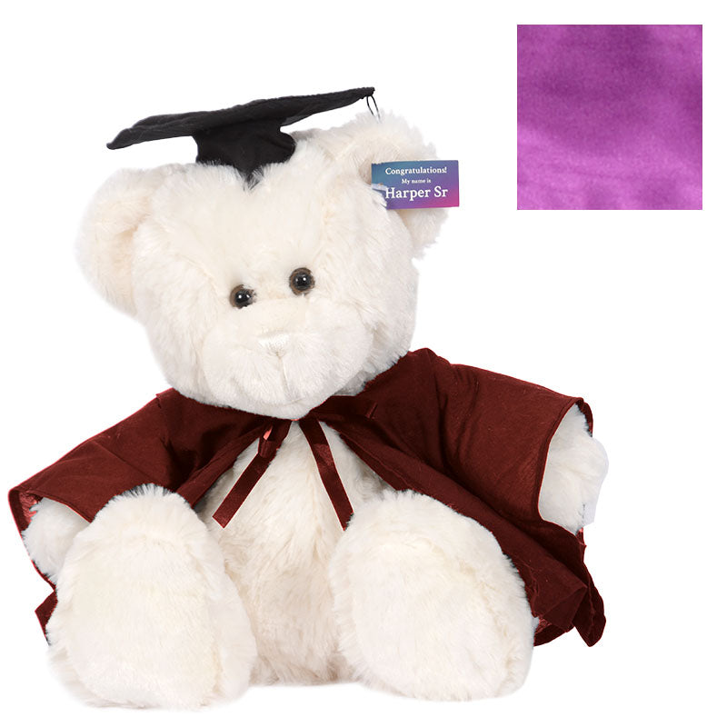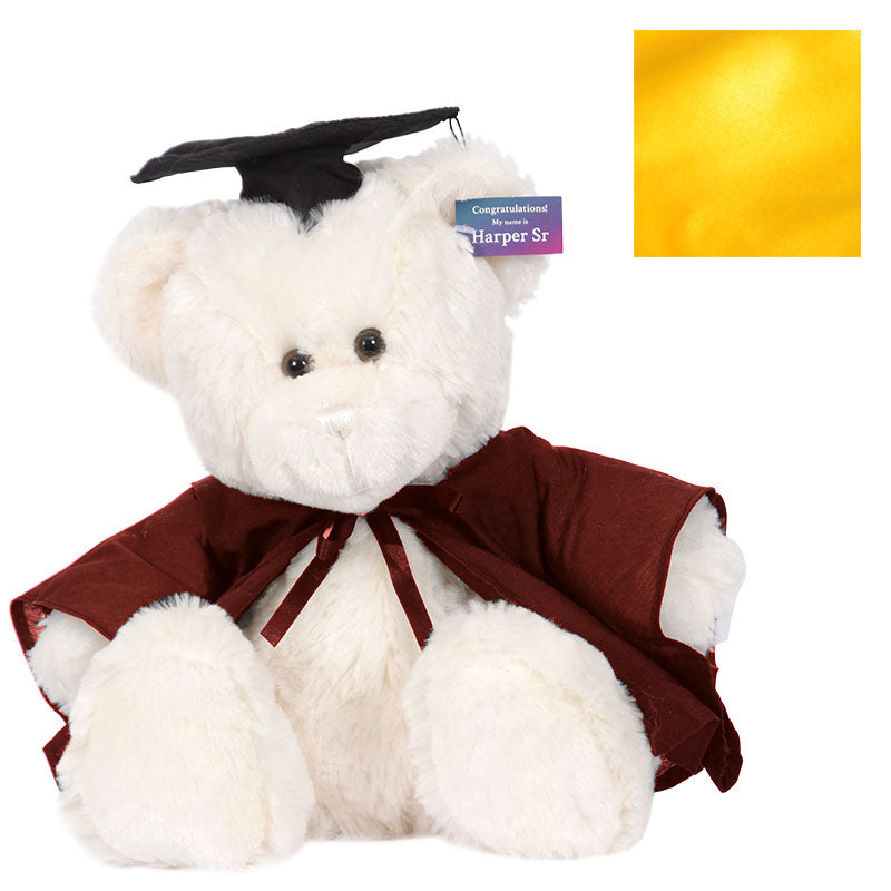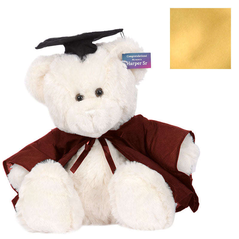 Cuddly HarperSeniorbear hassoftcreamfur and comes complete with graduation cap,robe& hood in your faculty colour