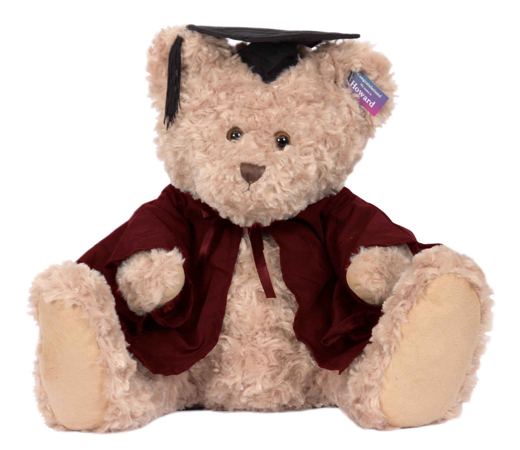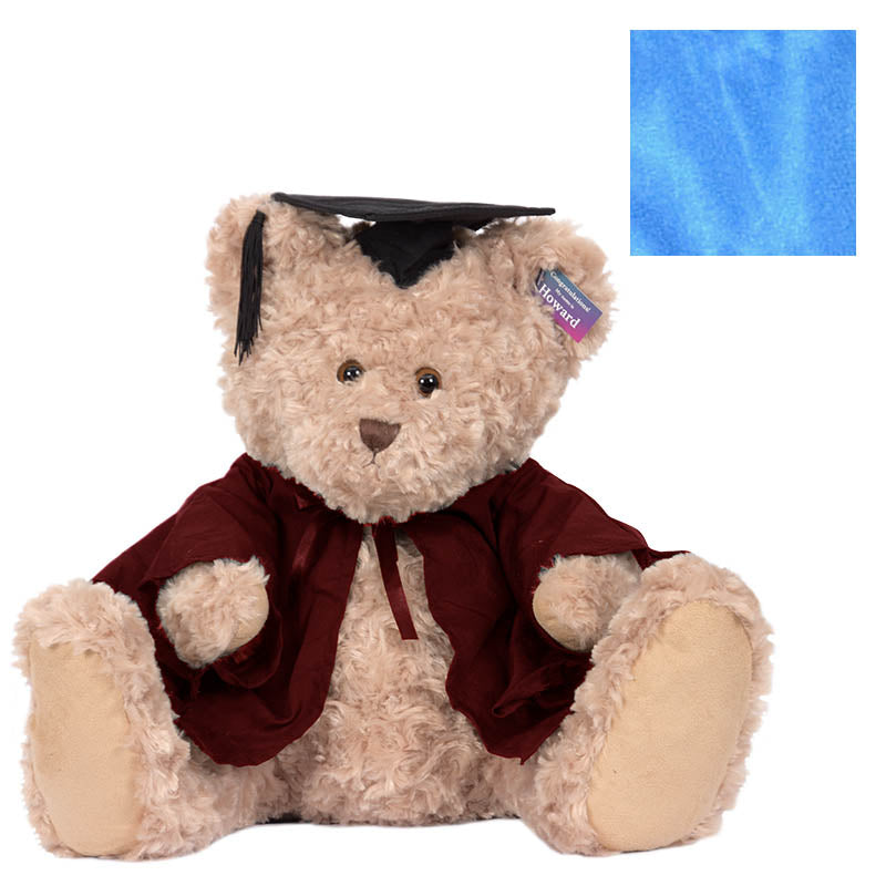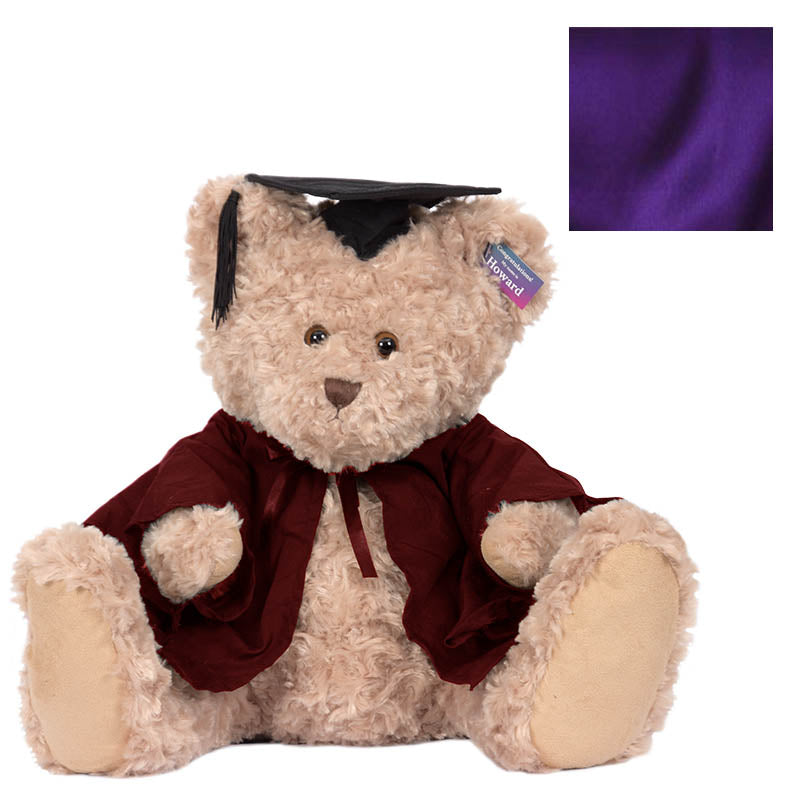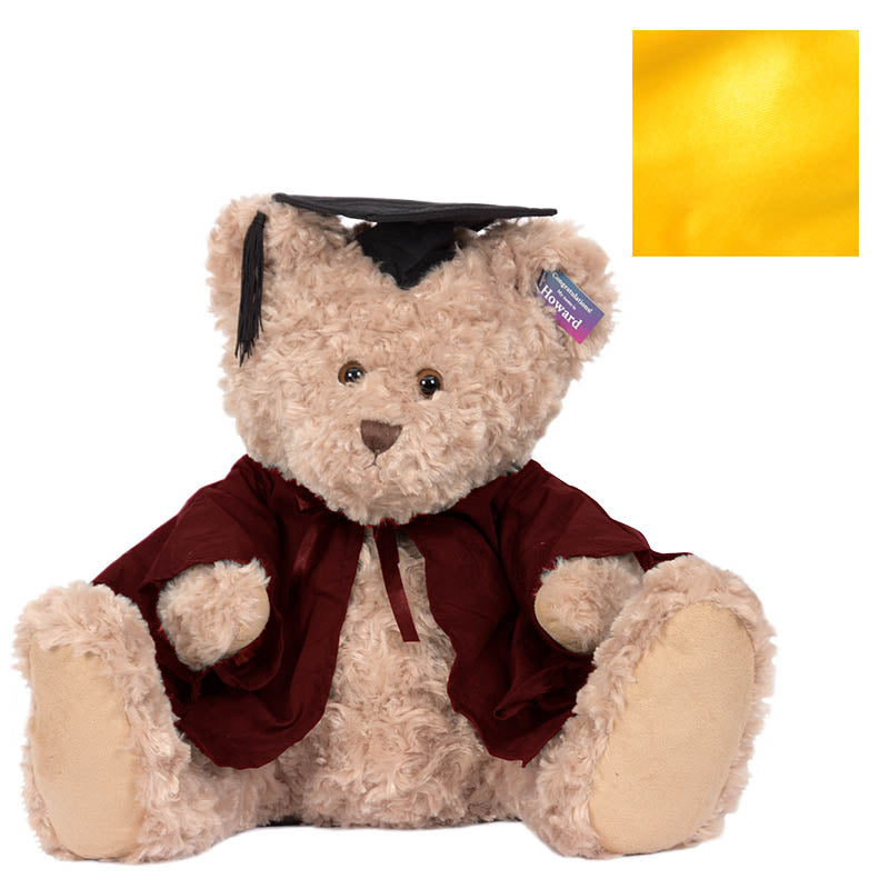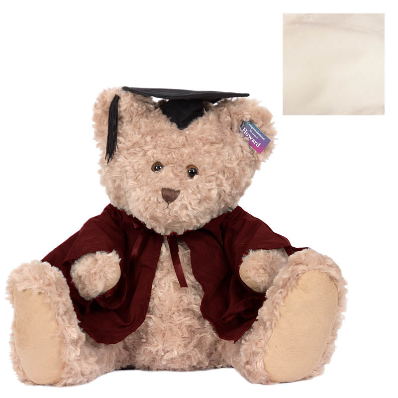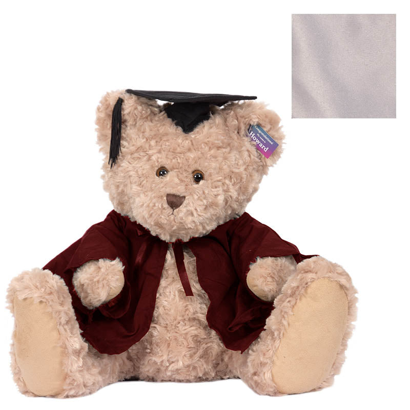 Cuddly Howard bear is a large bear (with extra-large feet!) He has short and curly beige fur, and comes complete with graduation cap, robe & hood in your faculty colour