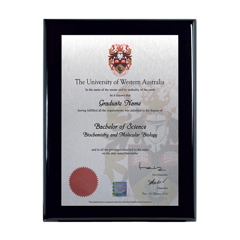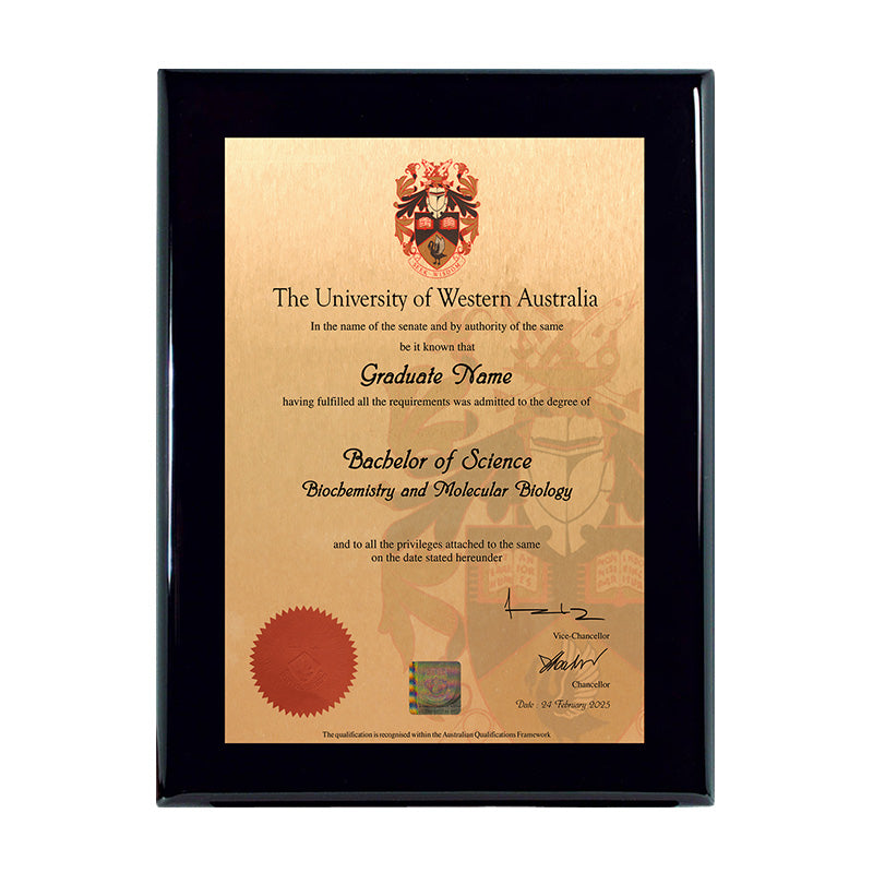 We will require a copy of your certificate in order to produce your plaque. Please email a copy to info@gfp.com.au. If you haven’t received your certificate from your university yet, please let us know, and we will keep your order on hold in the meantime. Your certificate will then be reproduced onto your plaque.