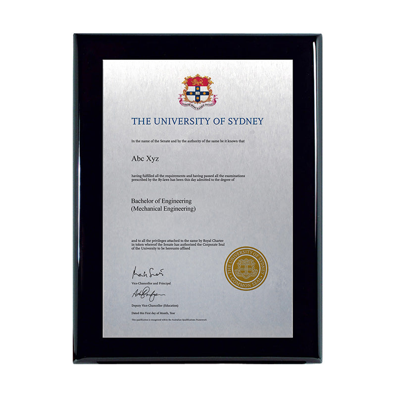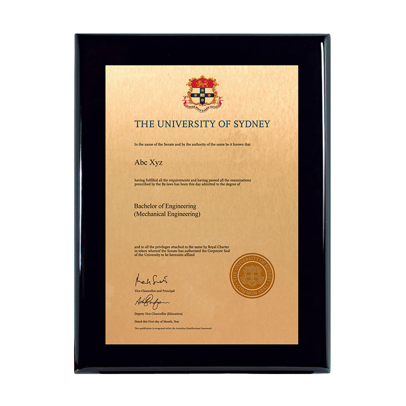 We will require a copy of your certificate in order to produce your plaque. Please email a copy to info@gfp.com.au. If you haven’t received your certificate from your university yet, please let us know, and we will keep your order on hold in the meantime. Your certificate will then be reproduced onto your plaque.